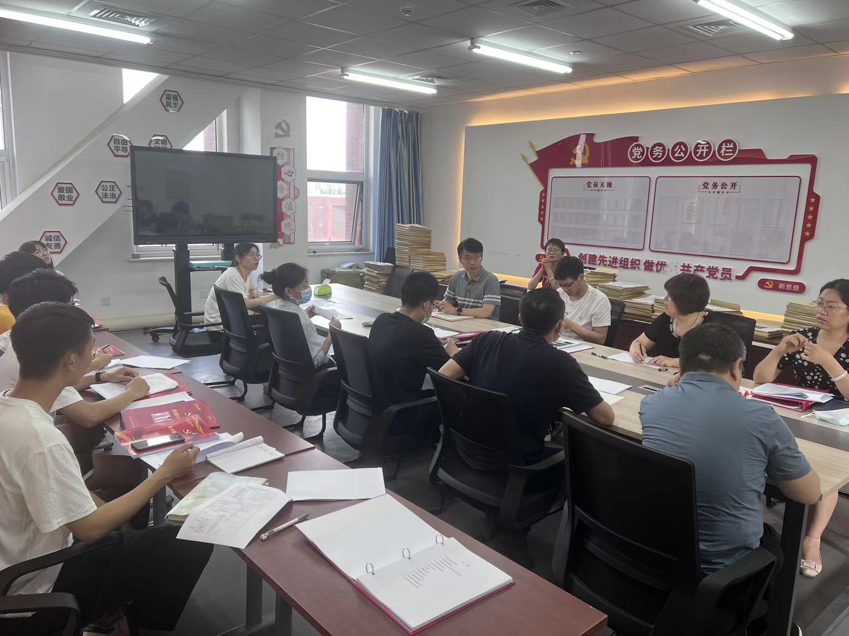 各党支部书记围坐一起,以现场评阅《党支部工作手册》方式对其他党支部2022年以来开展的各项工作记录情况进行检查,并将现场互查结果进行反馈。