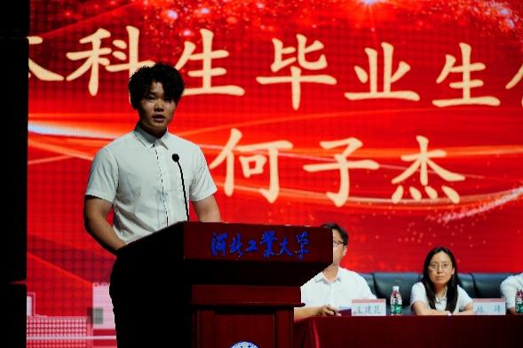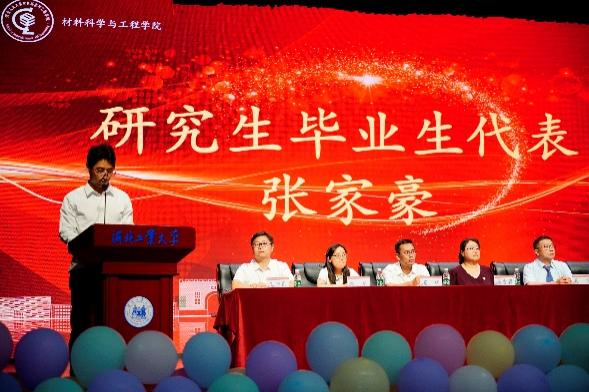 表彰过后,本科生毕业生代表何子杰、研究生毕业生代表张家豪依次上台发言,回忆了在校期间的难忘生活,表达了对老师们的感激之情并对所有毕业生送上了鼓励与祝福。