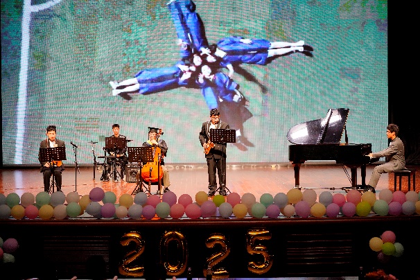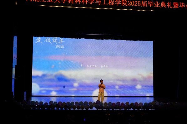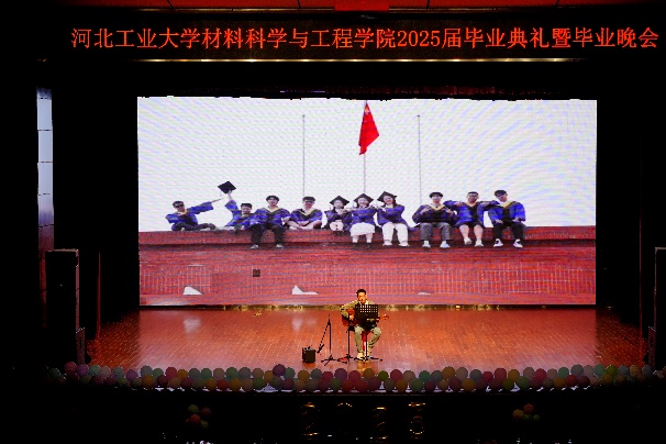 至此,庄严的毕业典礼结束。在温馨祥和的氛围里,晚会正式开始。在之后的节目里,师生们倾力表演。舞蹈、朗诵、歌曲、相声、合唱,充满力量的舞步点燃全场,动感的节奏让每个人的心都随之跃动;深情的乐队弹唱,将大学时光里的点点滴滴化作音符,飘进在场每个人的心里。中间还穿插着激动人心的游戏和抽奖环节,深受学生喜爱。琳琅满目的表演形式与别出心裁的互动体验,在毕业生的回忆版图中烙下深刻痕迹。
